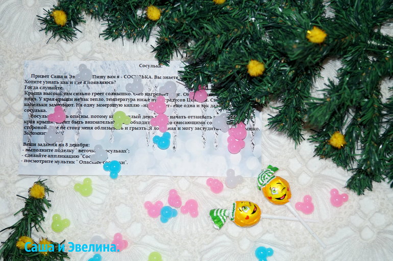 Привет Саша и Эвелина! Пишу вам я - СОСУЛЬКА. Вы знаете кто я такая? Я - замерзшая вода. Хотите узнать как и где я появляюсь? Тогда слушайте.Крыша высоко, там сильно греет солнышко. Оно нагревает снег. Он постепенно тает и капает вниз. У края крыши не так тепло, температура ниже нуля градусов Цельсия. Стекающие капельки замерзают. На одну замерзшую каплю «наплывает» еще одна и так далее. Образуется сосулька. Сосульки очень опасны, потому как в теплый день могут начать оттаивать и отрываться от края крыши. Стоит быть внимательными и обходить дома со свисающими сосульками стороной. Еще не стоит меня облизывать и грызть. Я холодная и могу застудить ваше горлышко. Запомните это!!! Ваши задания на 8 декабря: - выполните поделку " веточка в сосульках"; - сделайте аппликацию "Сосульки"; - посмотрите мультик " Опасные сосульки".