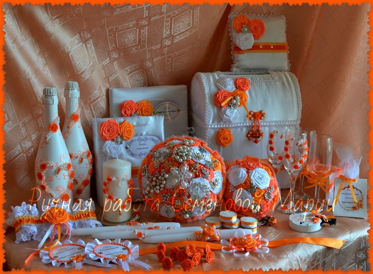 Этот большущий набор я делала для своей сестренки и ее теперь уже мужа. Свадьба у них была аж в прошлом году в июне, а я только сейчас смогла разобрать архив их торжества, вдохновение не приходило, наверное потому, что очень долго готовила все это богатство (с января по май) и просто устала от этой яркости. Когда я согласилась все сделать для них, то не умела совершенно ничего из того, что показано на фото(только подвязку могла сшить, но и то без украшений, розы то делать не умела). Они были предупреждены, но настолько поверили в меня, что даже я на волне предвкушения торжества начала творить.
