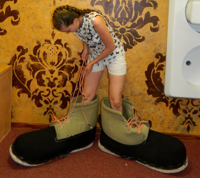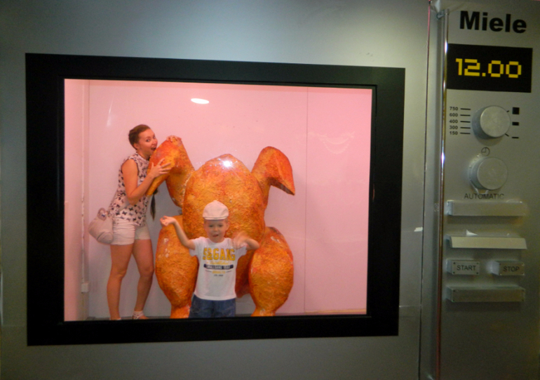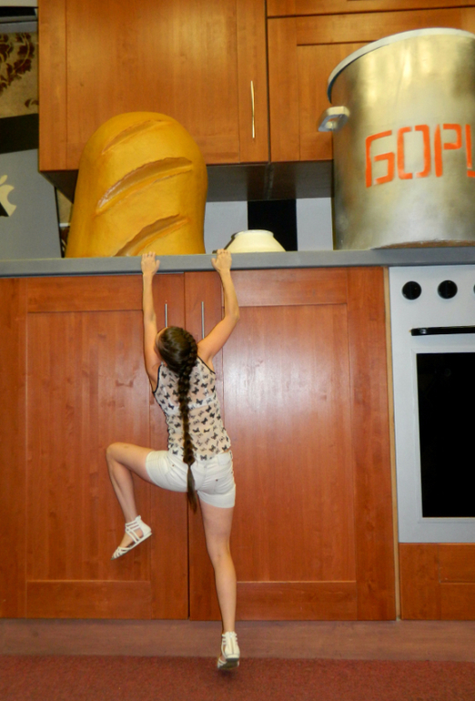 Дом великана разделен на зоны - это кухня со всем необходимым, ванная комната, гостиная, прачечная. Хочется отметить, что пропорции не соблюдаются. К примеру, банка сгущенки, губная помада, уточка для ванны, тюбик зубной пасты, раковина, кастрюля борща все одного огромного размера. Не поняла для чего нужны там пачка сигарет, нижнее белье и лезвие ограмадного размера. по мне так на это не интересно смотреть. К минусам отнесу духоту, вентиляция в здании страдает, да и тесновато.