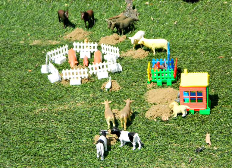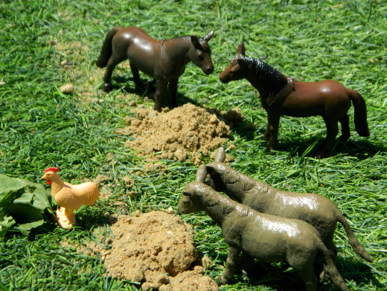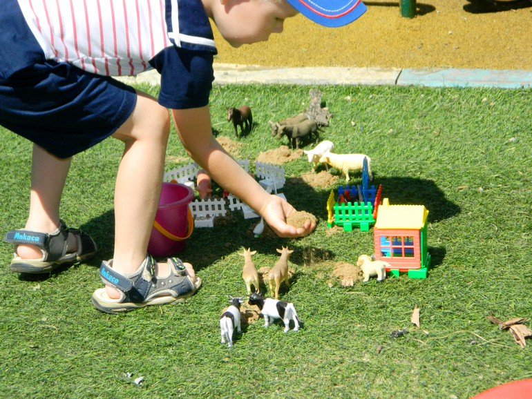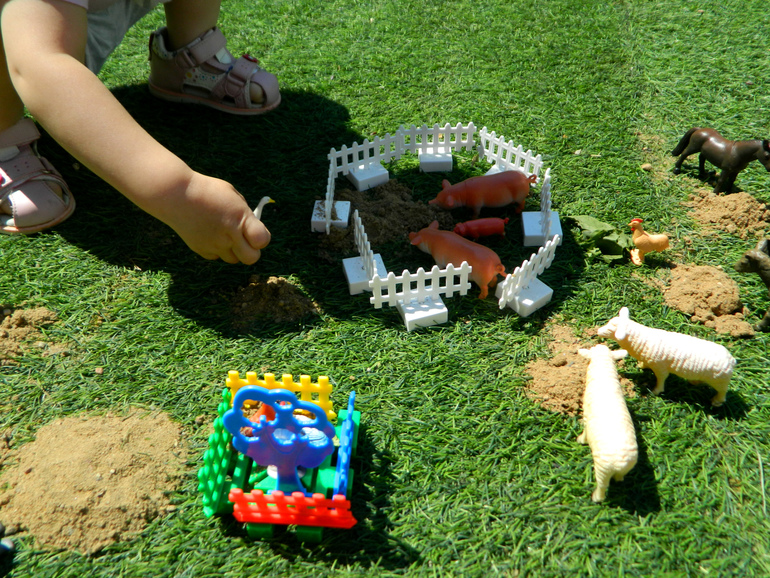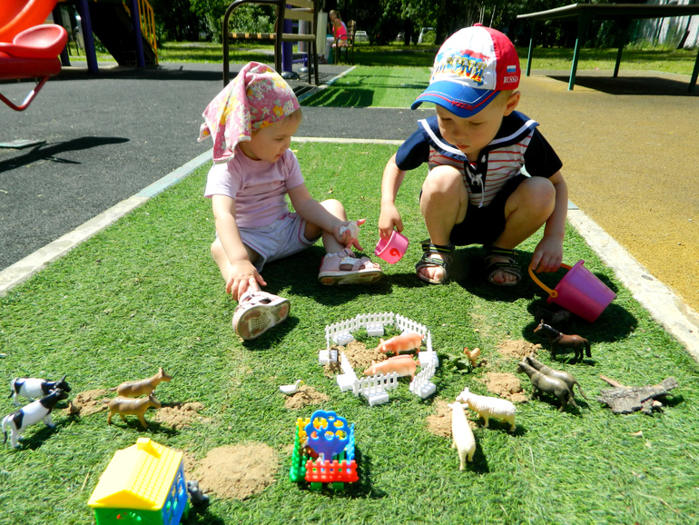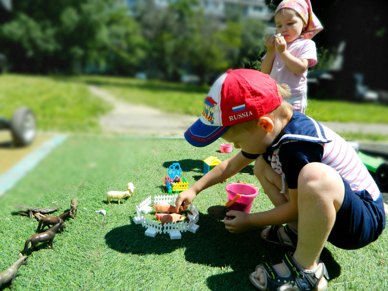 Сейчас у моего сына такой период, когда модельные машинки отошли на второй план, а фигурки животных ворвались галопом в его любимые игры. Ферму, зоопарк, пруд, лес, море мы часто теперь устраиваем дома. Сижу вот и думаю, а почему все дома и дома в этот зверинец играем? Вышли за рамки, теперь часто собираем рюкзак и на улицу отправляемся со всем этим добром. Санька их и расставляем и кормит, а Эвелиночка ему помогает как может.