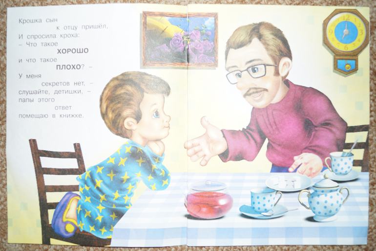 Папа прилег отдохнуть. К нему подбегает Санька и кричит тыкая книжкой в нос.