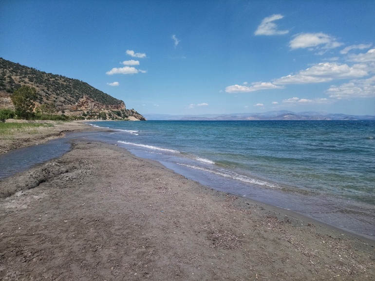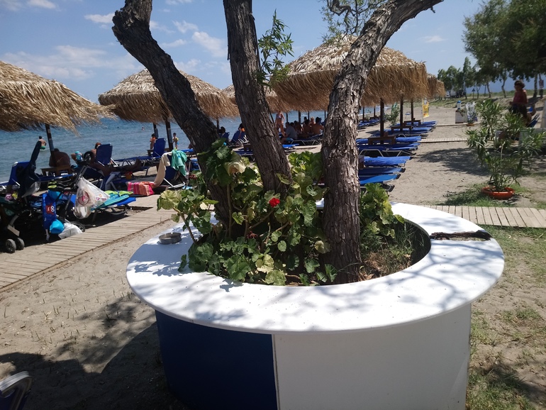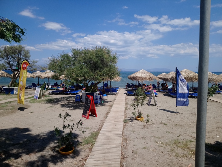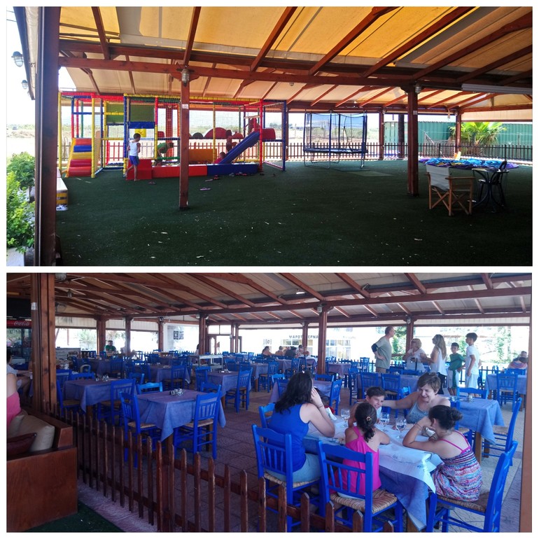 Это самый безлюдный пляж, Батарола. Здесь есть небольшая таверна, здесь мы пьём кофе, а сын играет рядышком с детишками. При таверне есть место для игр.