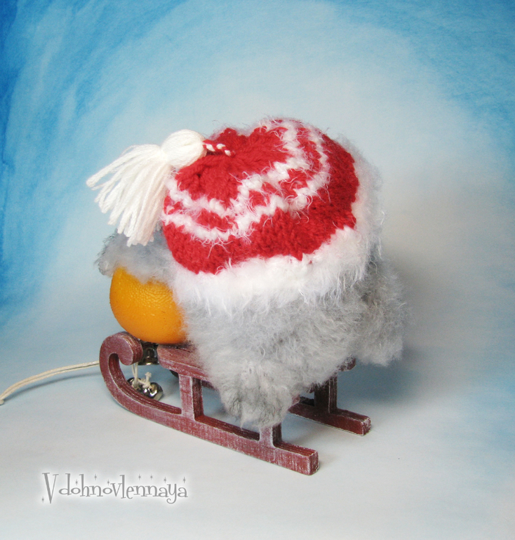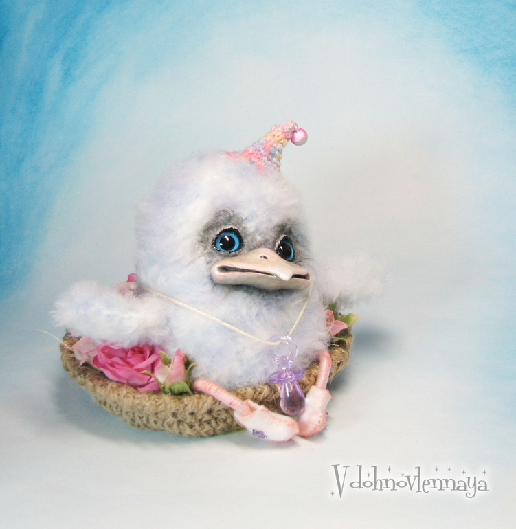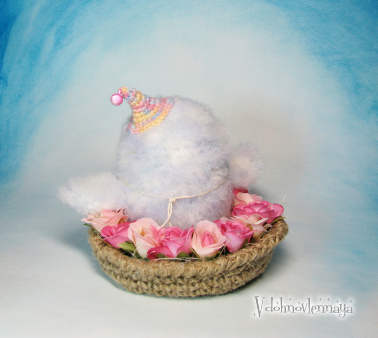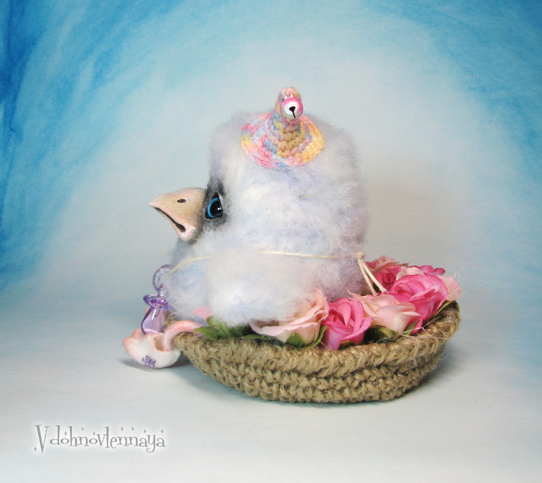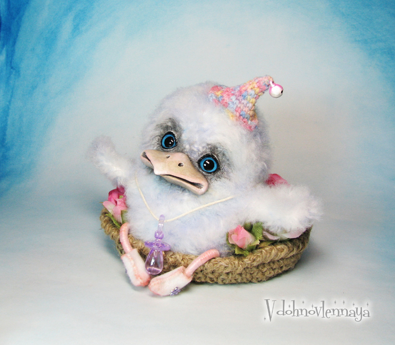 Детка связана из шелковистой пряжи, клювик слеплен и расписанакриловыми красками. Шапочка связана крючком.