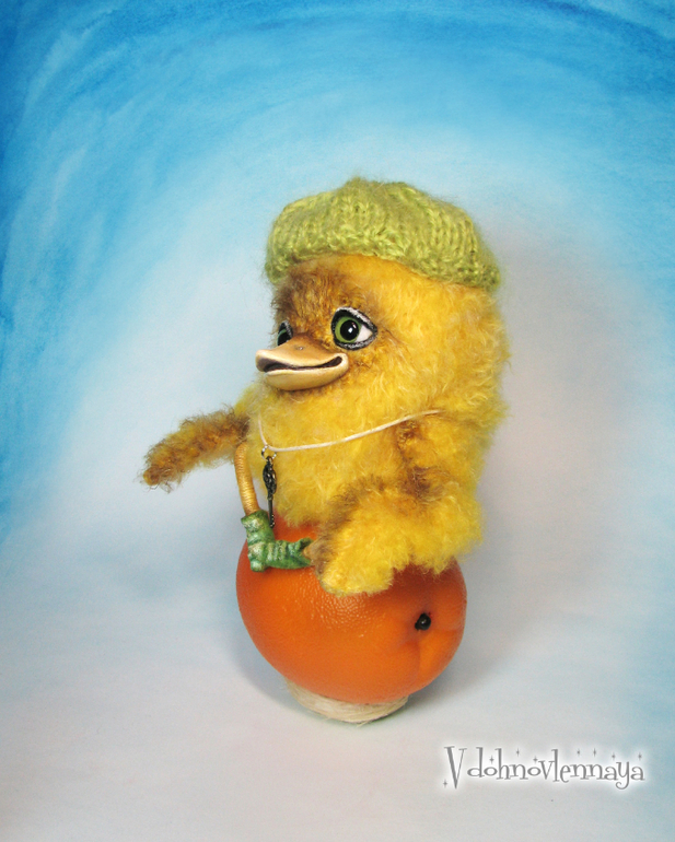 Цитрончик связан из шелковистой пряжи, клювик слеплен и расписанакриловыми красками. Шапочка связана спицами. Крылышки и ножки армированы.