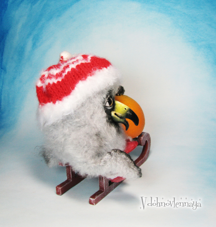 Орлюша связан из шелковистой пряжи, клювик слеплен и расписанакриловыми красками. Шапочка связана спицами. Крылышки и ножки армированы.