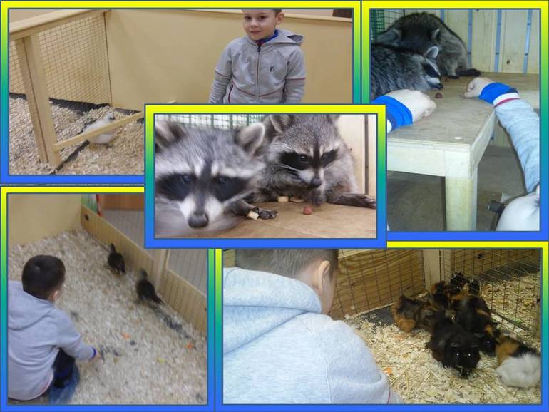 Есть кролики, морские свинки, хомяки, ежики, куры, утки, козы, лисы, еноты, носухи, черепашки, ящерицы, белки.