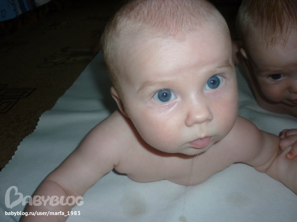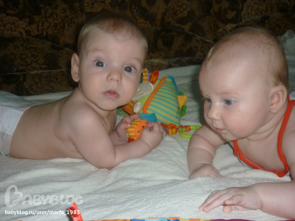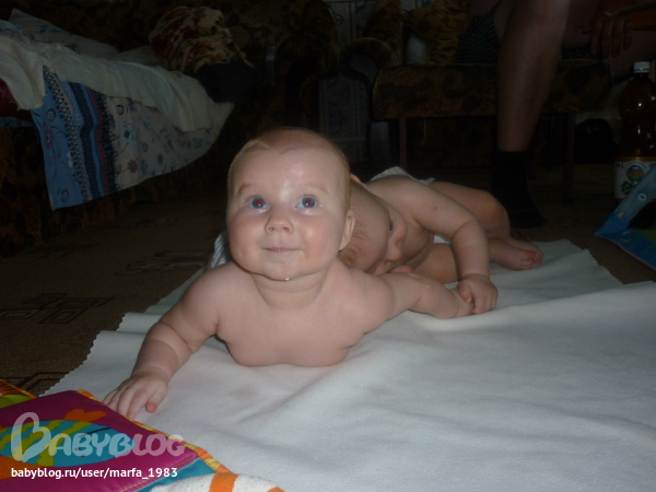 А еще мы научились с живота переворачиваться на спину....На живот мы сходу переворачиваемся уже с 2.5 мес,и спим на животе всю ночь,но делает так только на правую сторону...Начали по чуть-чуть ползать...да и как сказать ползать....поднимается высоко на ручках и перекидывает попу в сорону...так и передвигается..и еще назад пятится....Вобщем без присмотра на кровати не оставишь.