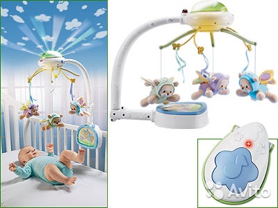 - можно добавить к проектору мелодию: теперь медвежата и картинки на потолке перемещаются под классическую мелодию. Мелодии переключаются нажатием кнопки с ноткой на куполе мобиля.