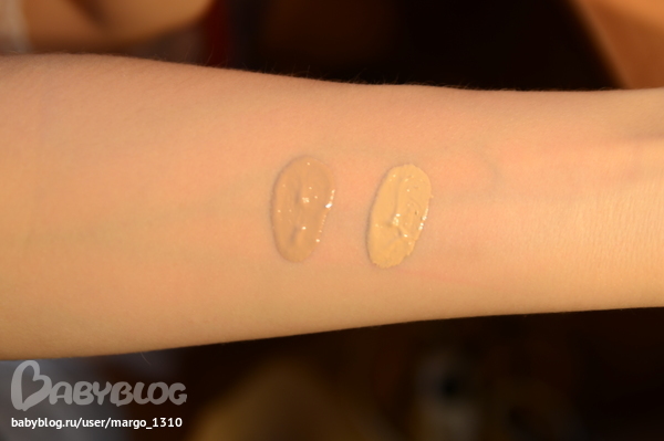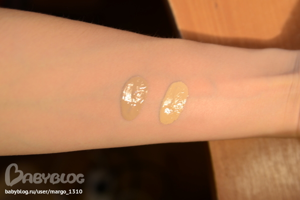 Не могу о нем сказать ничего внятного, потому что он мне просто не подошел... оочень светлый, с тоном кожи не сливается, но легче Миши это факт, пыталась пару раз его "втереть" в лицо, но его все равно видно... вот на руке он рядом с Мишей, пару фото под разным освещение, лампа и почти дневной свет (ближе к окну))