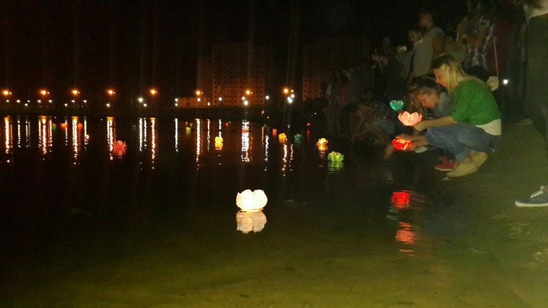ездили с друзьями отдыхать в г. Спутник на вечернее фаер-шоу и романтический сплав фонариков по воде...