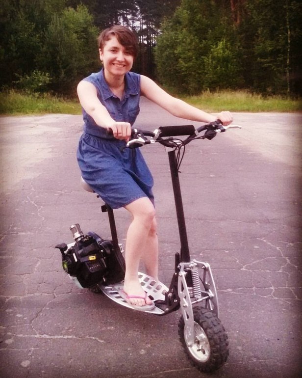Самокат? ))) Глазки не накрашены, волосы после озера высохли абы как. Некоторые в таких условиях сами себя в зеркале не узнают)