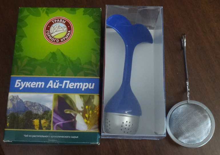 Чай Букет Ай-Петри ( душица, роза чайная, лист ежевики, шалфей, лаванда, мелиса, чабрец, шиповник (плоды), лист мяты, цвет боярышника, зверобой, бессмертник). Внимание! срок годности до 08.2012 ( не думаю, что это важно, но сказать должна)