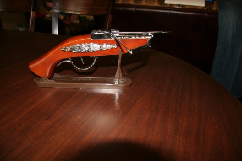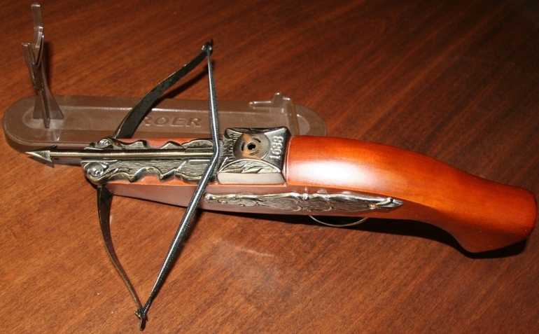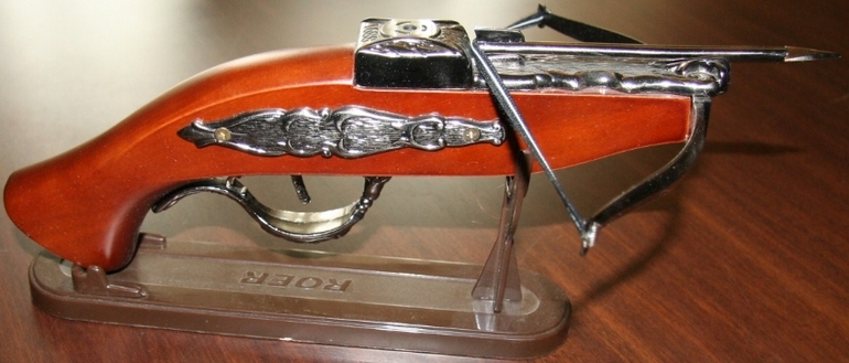 4. Декоративная настольная зажигалка Арбалет - модель 1688 г. Новая. Подставка- пластик, Рукоятка- дерево, инкрустация и механизм- металл, тетива- тесьма (резинка). Хороший подарок мужчине. Коробки нет. Цена 1300р.![]()
