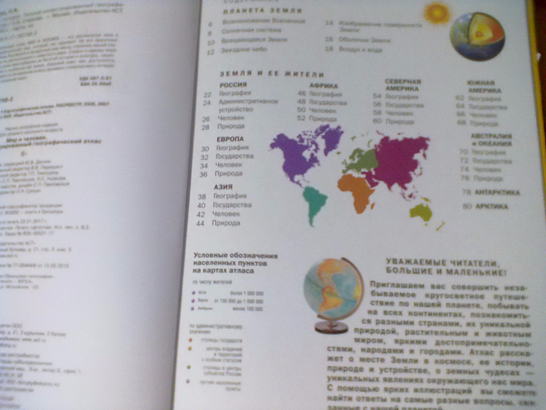 Увидела его и сразу вспомнился мне мой АТЛАС мира и называется также : , только он был в мягкой обложке, и более желтого цвета. Да и формат мне так кажется был по-больше. Так вот увидела я его и сразу поняла, что он мне нужен...да-да именно мне)) девочки то мои маленькие ещё, а ностальгия штука такая - требовательная))))