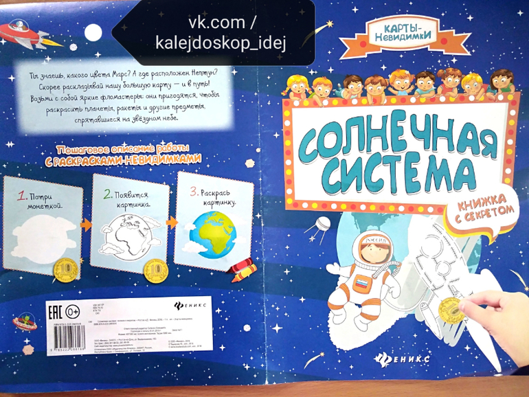 Плакат-игра для детей: "Солнечная система" издательства "Феникс". Изучаем планеты, развиваем мелкую моторику и раскрашиваем. Прежде чем раскрасить стираем монеткой по верху белого фона.