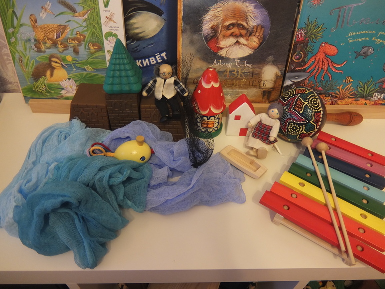 Поставили спектакль "Золотая рыбка". Перед этим прочитали книгу, Люба даже выслушала до конца))). Но для спектакля я приготовила пересказ, конечно. Слова типа "столбовая дворянка" я убрала, конечно. Просто говорила, что старуха хотела быть все богаче и богаче.