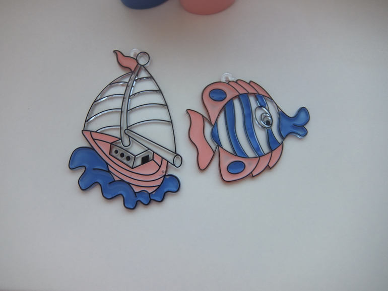 Еще попробовали сделать витражи... Что сказать? Рано, конечно. Делала я Любиной рукой. Красок купила на пробу всего 2, поэтому только двумя цветами раскрасили...