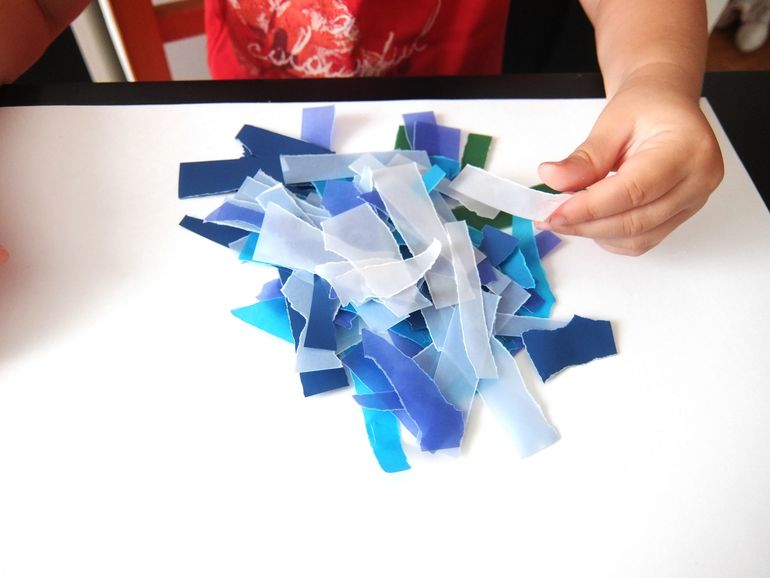 С Любой сделали витраж-аппликацию из полосочек цветной кальки. Я поняла вдруг, что ребенок не умеет рвать бумагу... Учила..