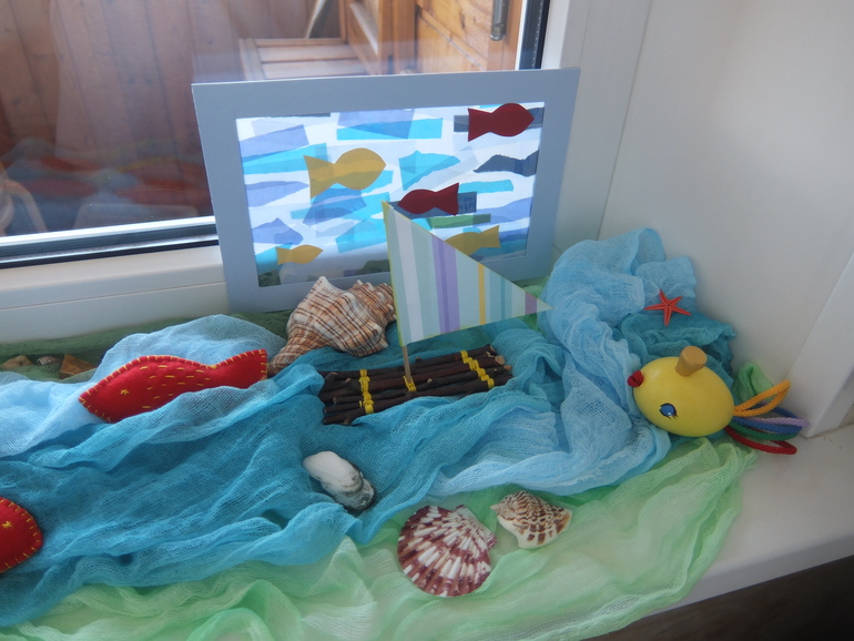 Море "волновалось" внизу - использовали покрашенные нами тряпочки. Сначала светлая самая, потом потемнее, затем еще темнее. А в конце сказки я вообще убрала марлю. И черное море символизировали темно-синие кулисы.