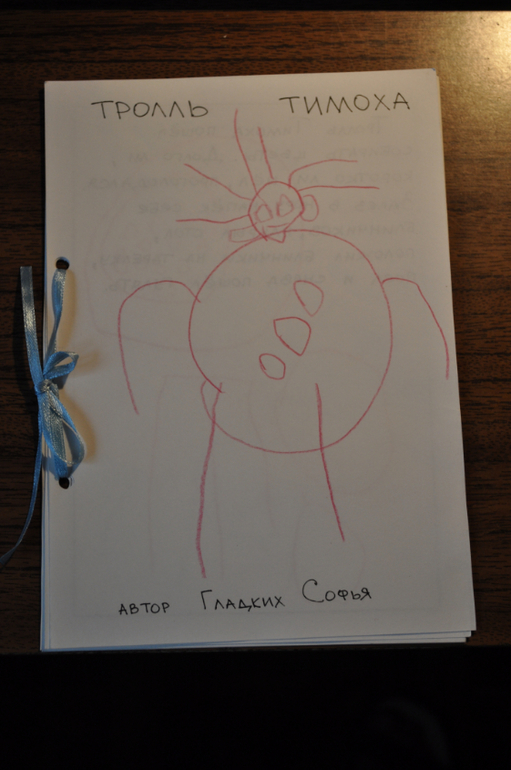 Вчера вечером Соня вдруг подлетела ко мне: "Мама, давай сделаем свою книгу!!!" И мы сделали. Соня сочинила историю. Я только один раз ее поправила, когда ее фантазия увела ее очень далеко от первоначального замысла. Не знаю, стоило ли, но мне показалось нормальным объяснить, что одна история обычно имеет один основной сюжет. Потом Соня нарисовала рисунки, а я собрала их в "книгу" и записала Сонину историю. Правда, когда я дала Соне листы для рисования, не продумала сразу, как я потом их в книгу буду собирать, поэтому получилось то, что получилось. Но для первого раза простительно.