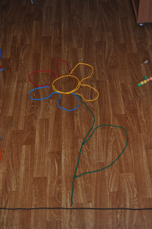 Сначала чуть-чуть повыкладывали картинки из дуг нашей пирамидки-радуги, но тут фотоаппарат еще не доставали. Да и выкладывала я, а Соня только угадывала, что получилось. Потом мне на глаза попались шнурки от шнуровального планшета (чудо-игрушка, предназначенная для детей от 3-х лет, но даже у меня не хватает терпения дошнуровать хотя бы одну картинку из предложенных в буклете, что уж говорить про Соню). Так что сегодня мы нашли этим шнуркам лучшее применение: