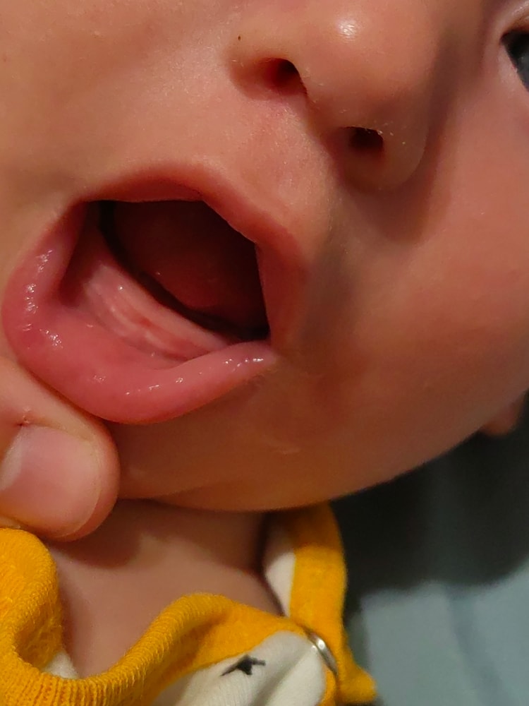 Maria , нее, пока не ждите, через месяцок загляните снова) На первой фотке видите, как будто гребешок такой вдоль всей десны проходит - перед пререзываением он сглаживается, т.к. десна отекает, и цвет слизистой наоборот темнеет