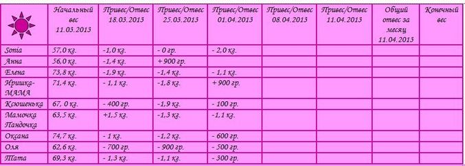 Девочки, еще одна неделька нашего похудения прошла! До завершения нашего спора осталось всего 11 дней)) Пишите свои отвесики, а я оформлю все в табличку*)))