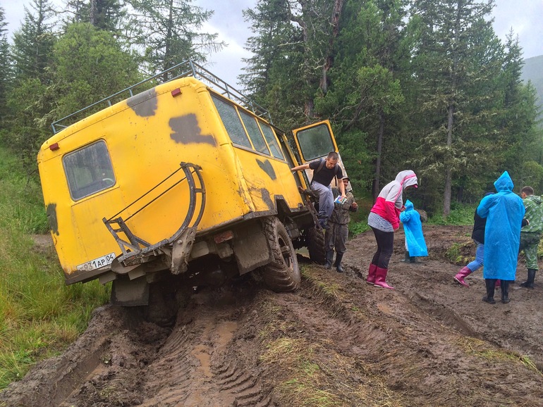 От Коксы мы уехали на 30 км в деревню Замульта. Пересели на шишку - ГАЗ 66. И проехали до озер еще 19 км. Ехали на шишке мы аж 3-4 часа. Но дорога там жесть. Такого адреналина я давно не получала. В некоторых местах нас просто высаживали и мы шли пешком, потому что шишига то и дело норовила завалиться на бок или скатиться с горы. Пошел дождь, стало холодно, но мы не сдались))) ехали дальше.