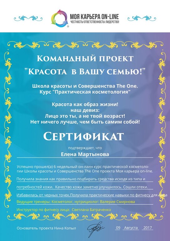 Елена Мартынова → Новенькая Спам Новороссийск Ура! Я получила сертификат специалиста по подбору продукции для ухода за кожей лица!!! Читать далее