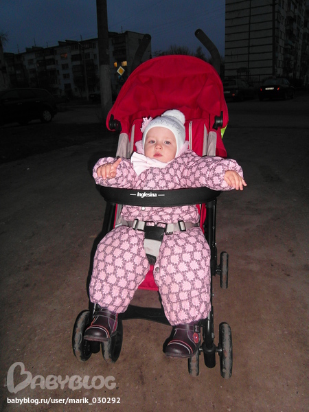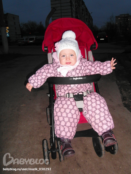Окончательно влюбилась в нее когда поехали в зоопарк и у знакомых я увидела такую! Покатала и сразу заказала себе такую же. После переги она пушинка, от ручек я вообще в восторге) Единственное что меня смутило, на коробке написано "сделано в Китае" и когда я только ее достала,пахла она не очень приятно((( Но после первой прогулки запах исчез) Вроде бы дочке она понравилась,с начало каталась она в ней с удовольствием. А сейчас когда мы влезли уже в зимний костюм доча начала из нее съезжать и висеть как-то на ремнях, а ноги даже иногда об колеса трутся. На подножку она их не ставит,то ли ножки коротковаты еще,то ли подножка не удобная! Да и сидит она сейчас постоянно руки растопырив в разные стороны. Вот смотрите сами)