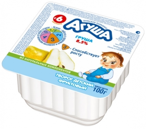 А это детский творожок Агуша, они есть разные, как классические так же и с разными вкусовыми добавками, все с 6 мес. Но можно и с 5 мес давать.