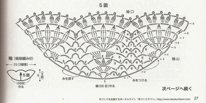 Странная схема. Как я поняла: 56 возд. петель. Нить обрываем. Присоединяем нить , где цифра 1 и стрелка с иероглифом: 5 возд.петель,столбик без накида, пико и далее до конца ряда (ряд кончается где большая полукруглая стрелка) нить оборвали. Второй ряд: где цифра 2, нитку присоединяем. С третьего ряда нитку можно не обрывать.