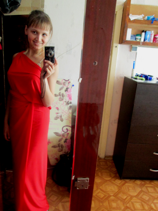 Это я ненакрашенная ни грамма, обычно черные стрелки, тушь. Волосы русые, до плеч. Платье планирую не такое длинное, до колена и выше. Намотала ткань, это еще не платье.