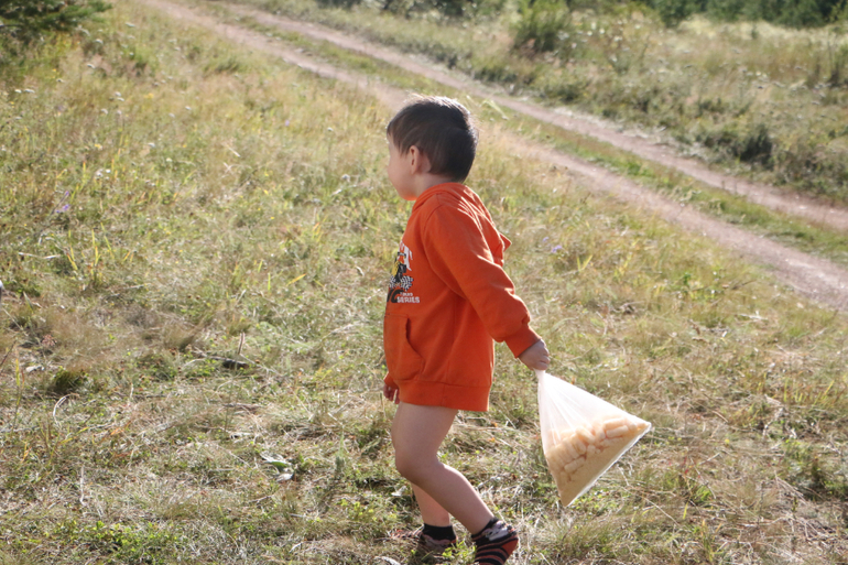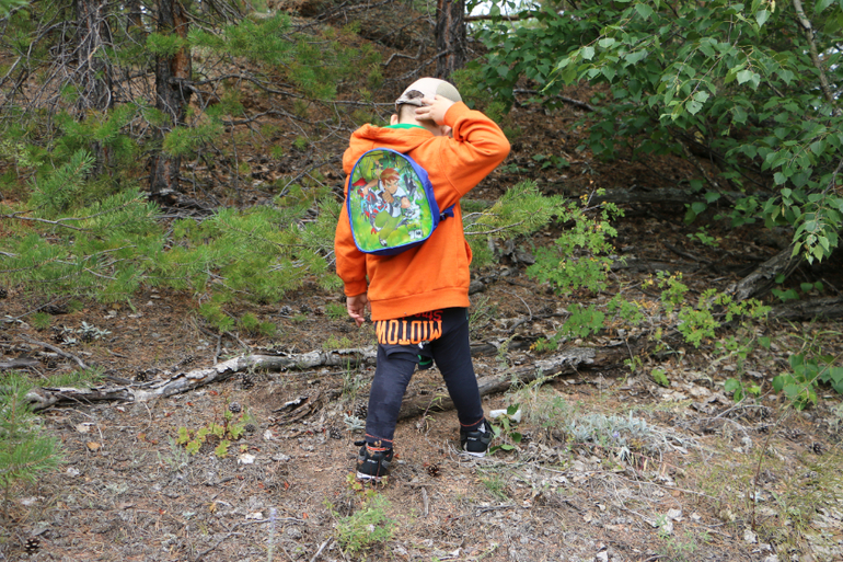 собирались быстро и с просоня. я думала что едем не далеко и взяла 1 запасной памперс. не взяла никакую запасную одежду. еще в дороге максим начал жаловаться что болит живот. в итоге оказалось понос. оба памперса подряд уделал как только приехали. полезли в горы уже без памперса, просто в штанах. по дороге опять стал жаловаться что болит живот. в кустики не писиет, сколько раз пыталась на прогулках - ни в какую не хочет. и в этот раз не захотел в кустики ничего делать. раза 3 его подхватывали и снимали штаны. безрезультатно. в итоге наделал в штаны. с собой в пакете были влажные салфетки и бутылка воды. кое как в экстримальных условиях помыли максима. стоим думаем что дальше делать. муж уже думал свои трусы не макса одеть, потом додумался переделать кофту в штаны.