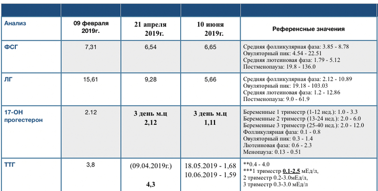 Анализы я сдала , ниже представляю сводную таблицу с результатами в динамике: