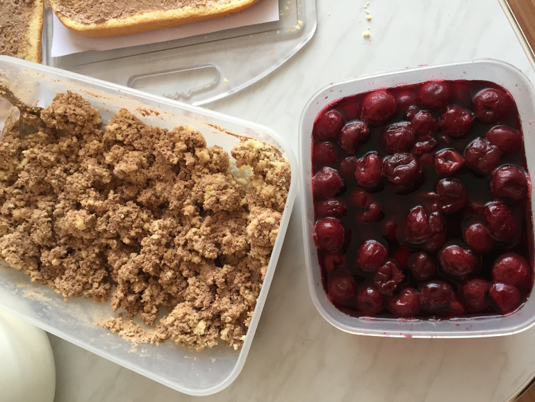 Уложить мякиш в коробочку, смазать частью оставшегося крема, высыпать оставшуюся вишню. Покрыть еще слоем крема (я этого не делала, - на мой взгляд, слишком жирный получится), положить сверху бисквитную "крышку". Весь торт обмазать кремом.