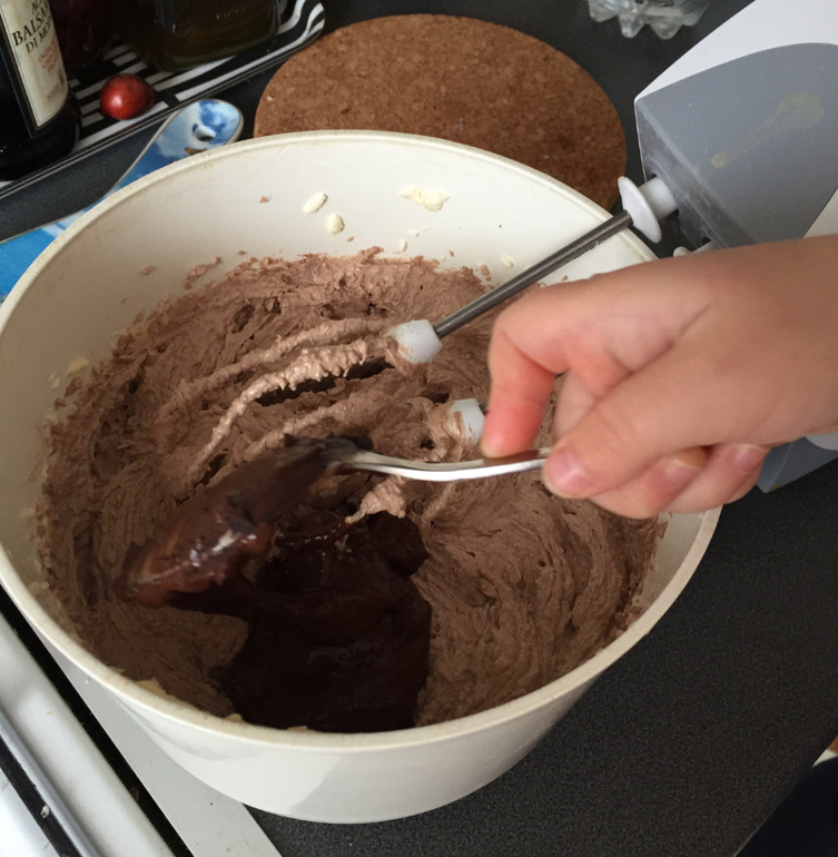 Осторожно мешая ложкой сверху вниз, смешать с мукой, предварительно перемешанной с какао.