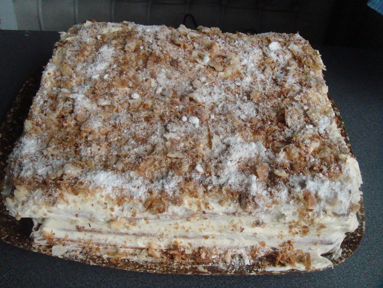 Сверху следующий корж и повторяем. Верх и бока торта тоже смазать кремом. Посыпать крошками и пудрой: