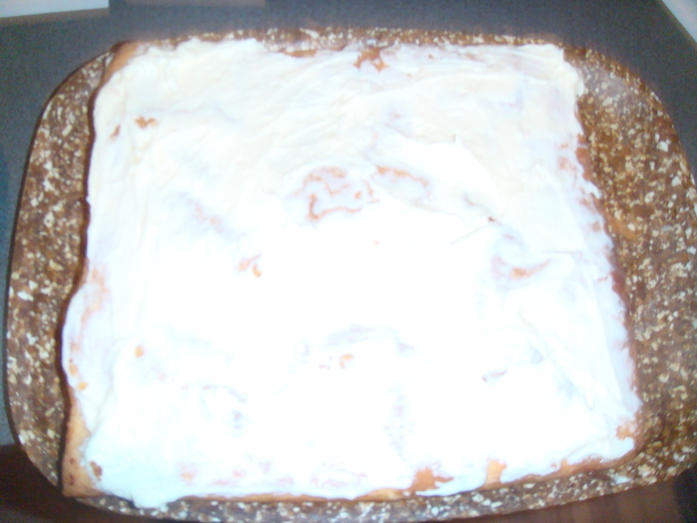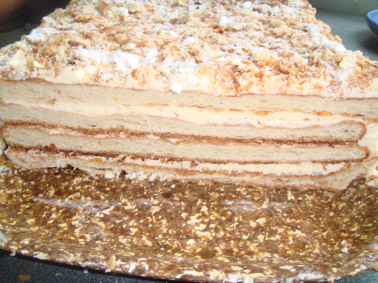 Заварной крем готов. Собираем торт. Кладем на поднос корж, смазываем четвертью крема: