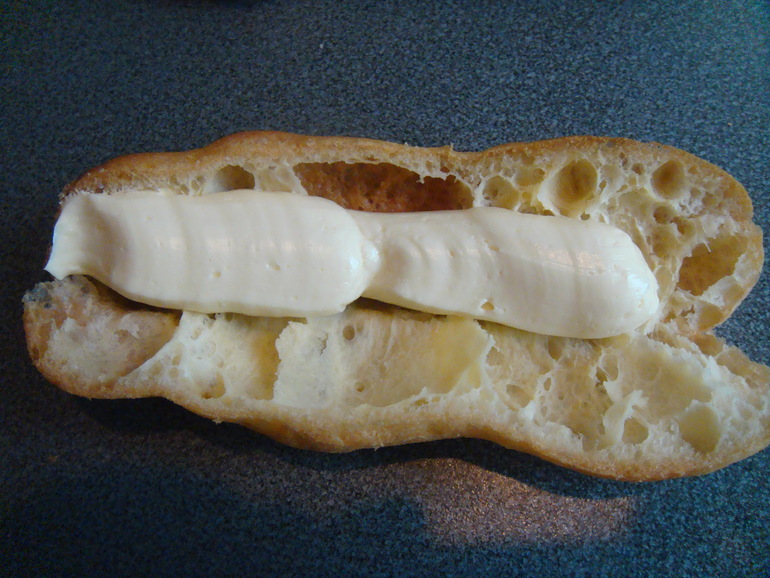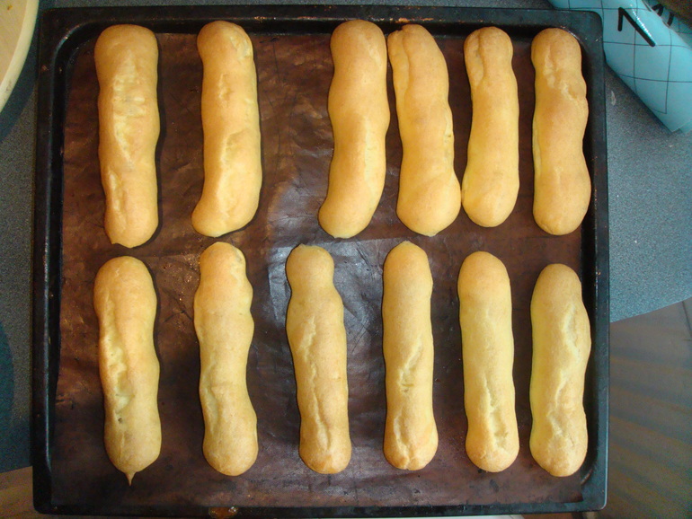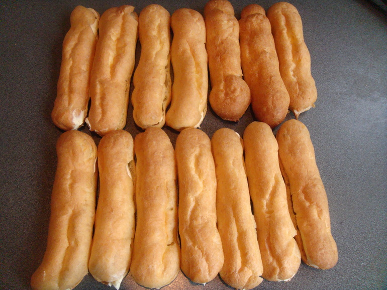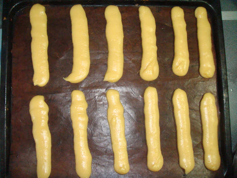 Про заварное тесто писала несколько раз в своем дневнике. Просто напомню, что надо влить в миску 1 стакан воды и вскипятить со 100 г сл.масла. Затем в кипяток всыпать стакан муки и быстро замесить тесто. Затем по одному вмешать 4 яйца: