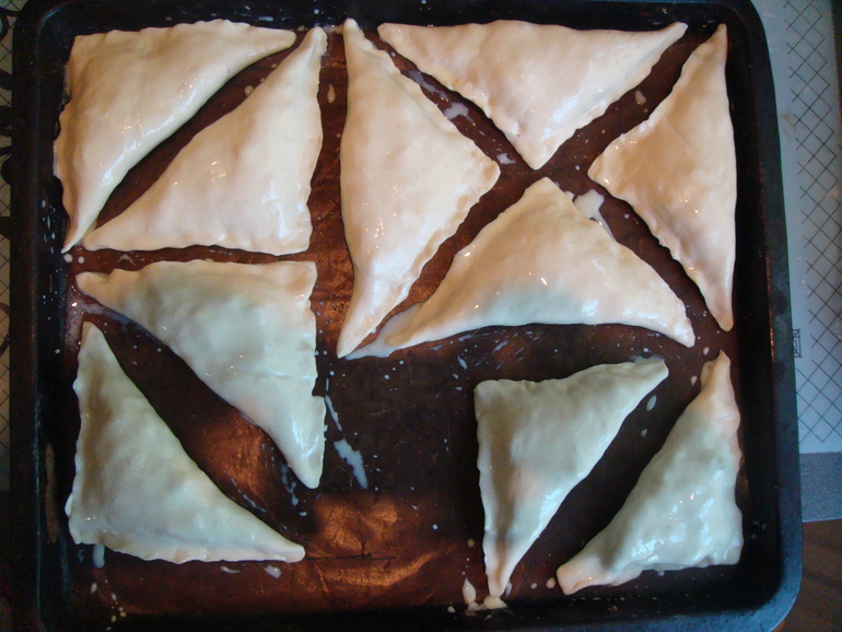 Свернуть пирожки. Разложить на противне. Смазать яйцом: