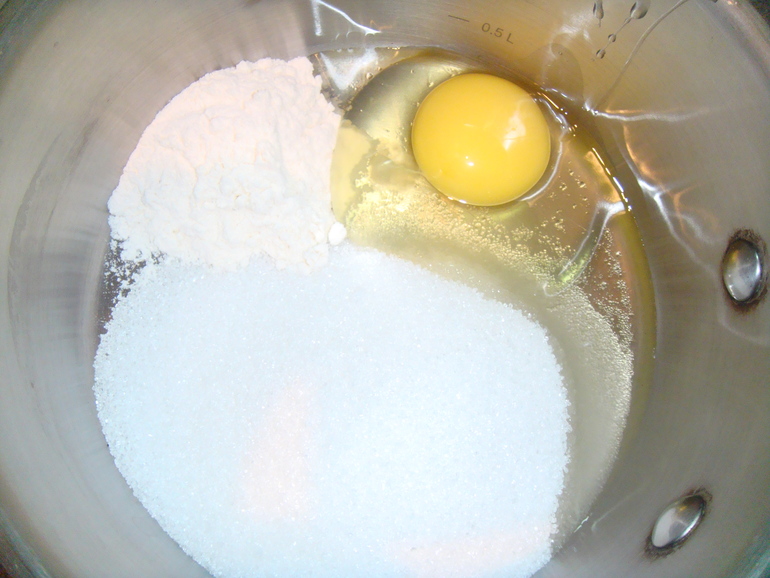 Положить в ковш стакан сахара, 1 ст.л. муки, 2 яйца: