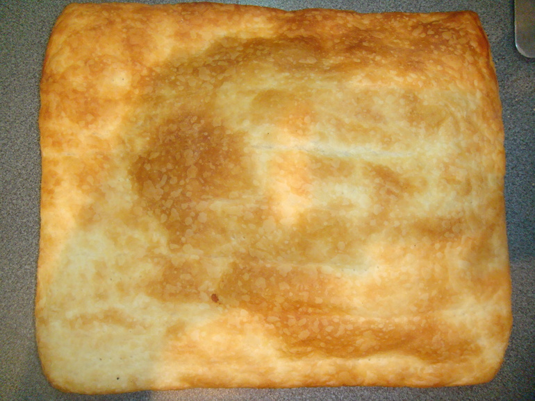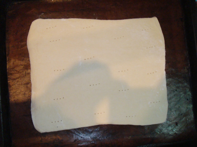 Понадобятся 4 пласта готового слоеного бездрожжевого теста. Я их немного раскатываю до прямоугольника. Положить на противень, проткнуть вилкой: