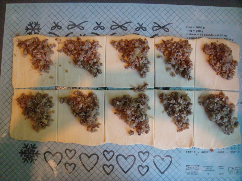 Тесто немного раскатать, нарезать на квадраты. Разложить начинку в уголки:
