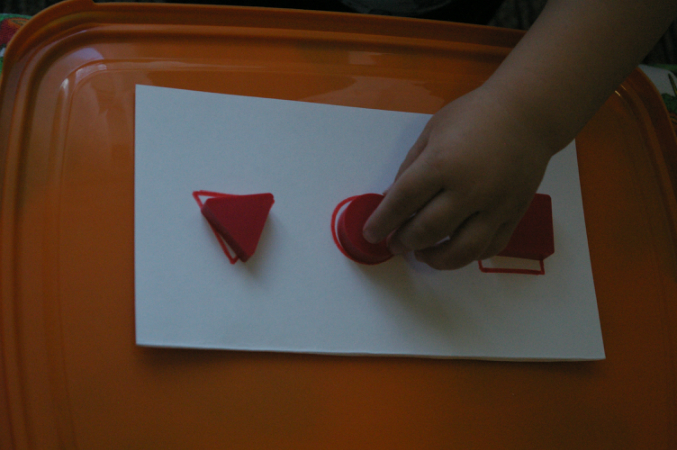 Попробовали играть в геометрическое лото. Справился быстро (нужно усложнять), показал, чем 2 поля отличаются, и фигуры на место разложил: