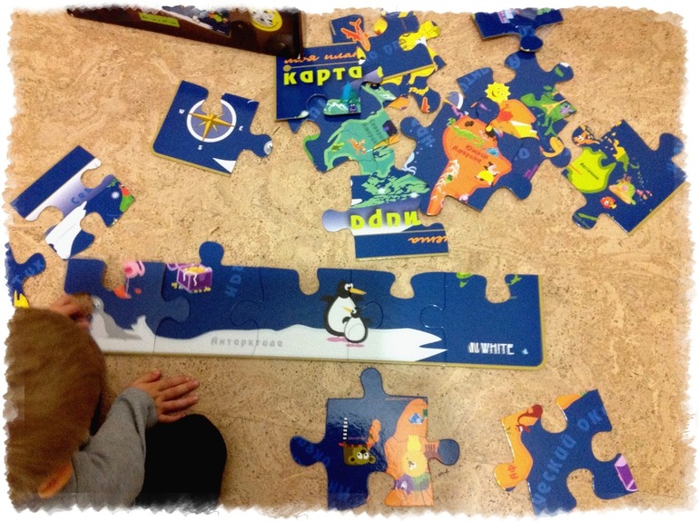 Пока кормили пингвинов, нам течением принесло чемоданчик с картой. Картой не простой, а карта-пазл (Оксана, спасибо за наводку!). Мы его быстренько собрали и уже на ней нашли нашу Антарктиду