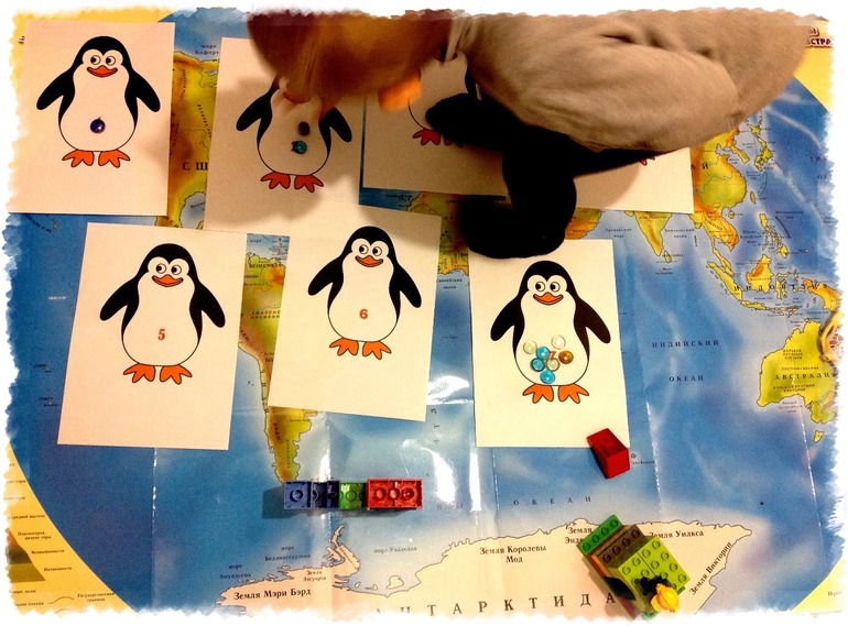 А мы поиграли в игру что куда одевается.( Сына хохотал в голос, когда я с серьезным видом сообщила, что варежки носят на ногах и летом валенки одевают. Смутить его мне так и не удалось). Кроме того, что Антарктида самый холодный материк, он принадлежит ученым, которые его исследуют. Мы тоже по нему не много прошлись, пока не замерзли и встретили целое семейство пингвинов. Они были очень голодные и попросили нас их накормить. Но так как говорить они не умеют, то чтобы знать кто сколько хочет съесть рыбок у них написано на животике. Мы с удовольствием их покормили (следя за тем, чтобы маленький почти 9 месячный исследователь, который так и рвался помочь брату, случайно не накормил себя этой "рыбкой ")
