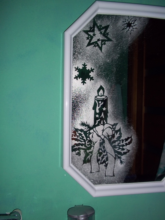 из воспоминаний из детства: я раньше рисовала на зеркалах и дверях зубным порошком. раньше же двери были посередине с прозрачным стеклом....Рисовала снеговиков, снежинок ,елки....а сыну не даю почему-то рисовать...может потому что художественного таланта нет, может потому что зеркало 1 большое, остальные мелочь, а может потому что мне это все потом мыть)))))