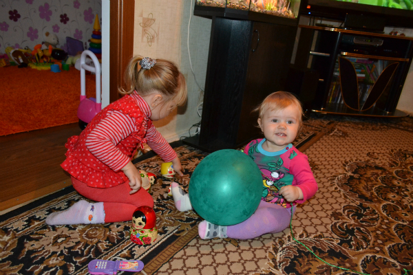 На прошлой неделе приезжала в гости двоюродная сестра Настя. Ух, и наигрались сестрёнки, набегались, натанцевались. Я ещё раз убедилась в общительности своей доченьки. Эвелине год и месяц, Насте 3,5. Но в их играх разница в возрасте практически не ущущалась. Разбирали-собирали пирамиды, сортировали геометрические фигуры, складывали матрешку, катали кукол на каталке, бегали по дому с воздушными шарами (они у нас ещё с ДР обитают), прятались в палатке-домике, ну и веселились от души!