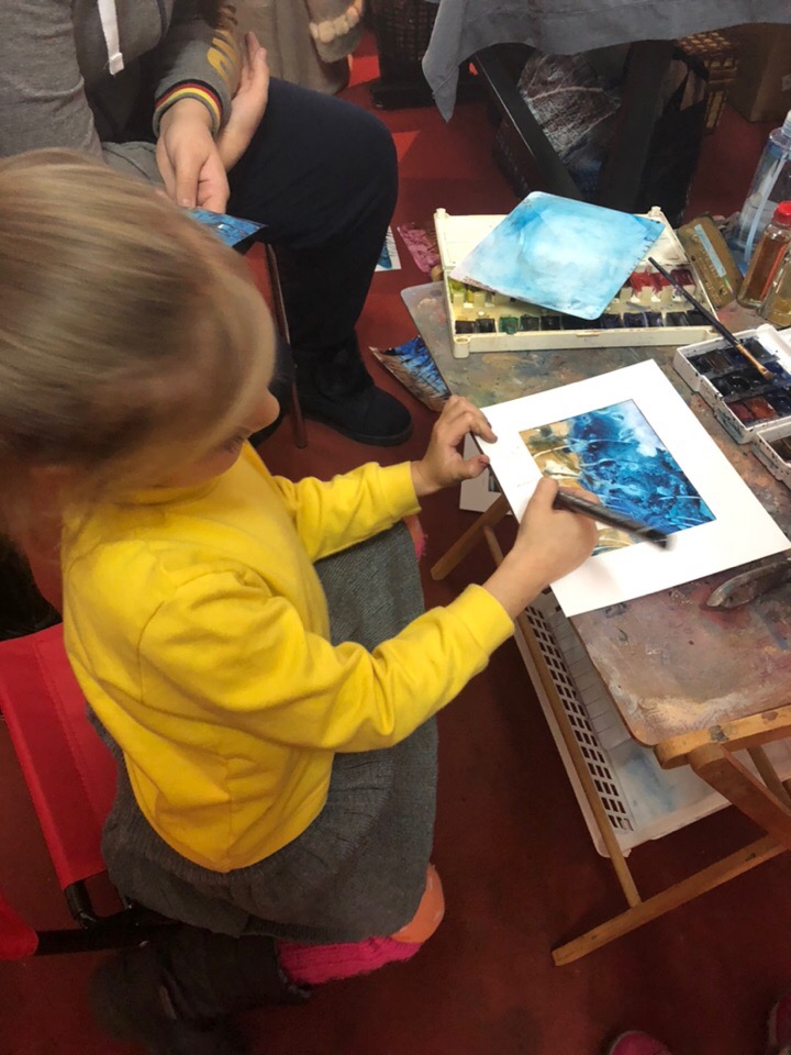 Поехали на Арт-выставку, там моя художница устраивала мк по абстрактной акварели для детей. Она ж пригласила моих девочек, я обещала. Успели